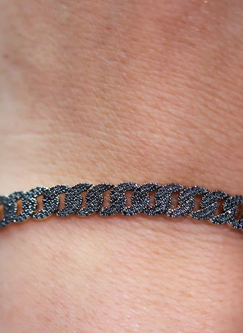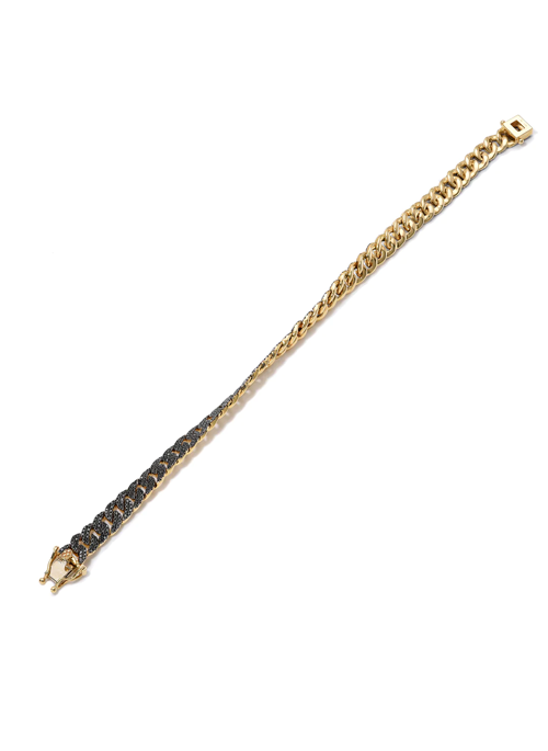 Created in solid 14k gold cuban link with hand set black diamonds on one side. Total carat weight is approximately bracelet 1.90ctw.