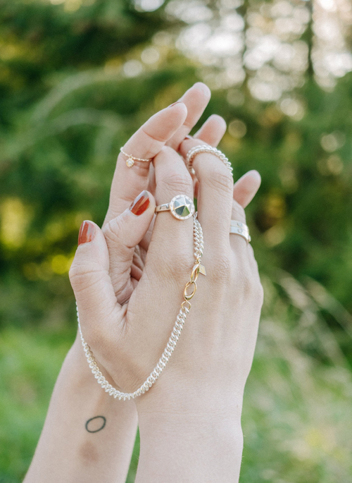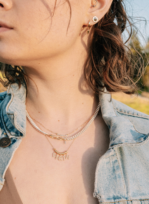 I am the perfect everyday Sterling chain necklace with the added sophistication of a two part yellow gold lobster clasp + loops on the end. Wear me with the clasps in the front or on the side to show my stunning detail. Or in the back if you just want a simple chain. Great by itself and also great for layering. Has a matching bracelet.-