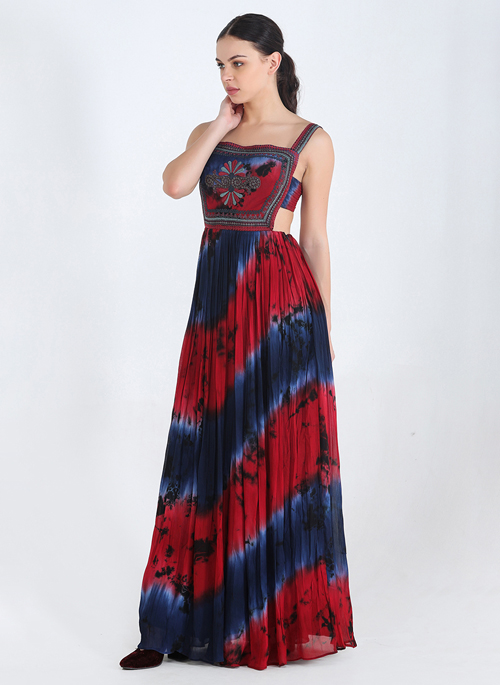 Blue, red, and charcoal tie and dye georgette cut out maxi with embroidered bodice