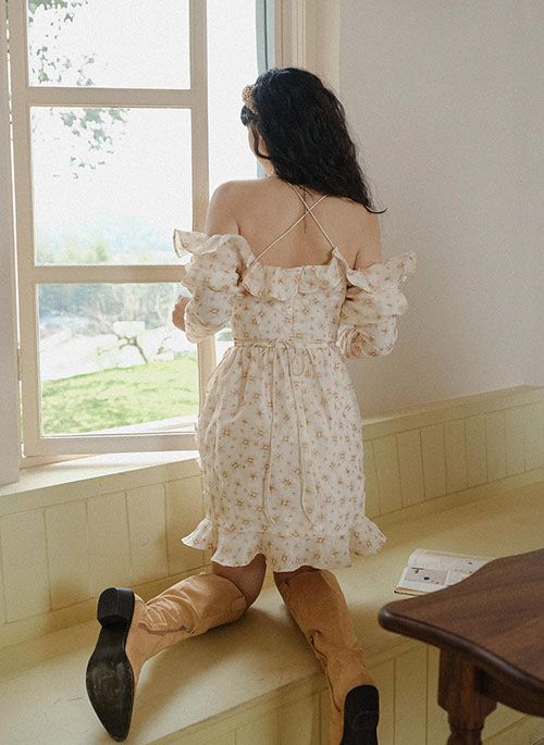 - Floral print & Off-shoulder & Center back zipper & double strap