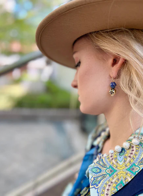 This handmade earrings features round lapis with snowflake golden ball and Japan brass findings.It's beautiful and feminine, pair with Farra bracelet and necklace to create your own style. Matching with blouse and midi dress for daily life or special event looks stunning! Also, this is a very lovely gift for birthday or anniversaries.