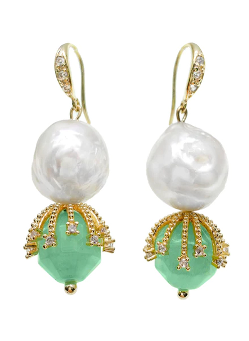 This pair of earrings features irregular freshwater pearls with green aventurine and Japan golden plated brass findings. It's pretty and feminine, matching with midi dress, blouse or blouse. Pair with Farra bracelet and necklace to complete your look. Also, this is a very lovely gift for birthday or anniversaries.