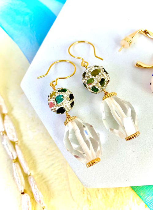 These handmade earrings are made of white quartz with rhinestones bordered tourmaline and Japanese golden plated brass findings. Wear this pair of earrings and match with a straw hat and keep a simple hairstyle to complete your outlook.