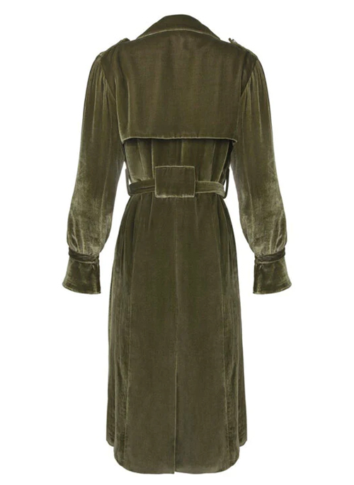 Wear this trench coat to work for inimitably cozy luxury, or out on a date for a night you'll never forget. You'll feel like a princess in your flouncing sleeves, and a boss in the military-style epaulettes. Nothing could be softer than this velvet, but don't be fooled -- it's tough enough to withstand a night out on the town! Cinch the belt around your waist for a gorgeous hourglass silhouette, or skip it entirely for a casual drink with the girls. And yes, ladies: it has pockets.Details: