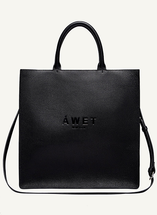 Smooth bovine leather embossed with the ÁWET logo with a gentle Matte black sheen. Genderless by design, the tote can be carried by hand, with handles or worn on the shoulder with strap.