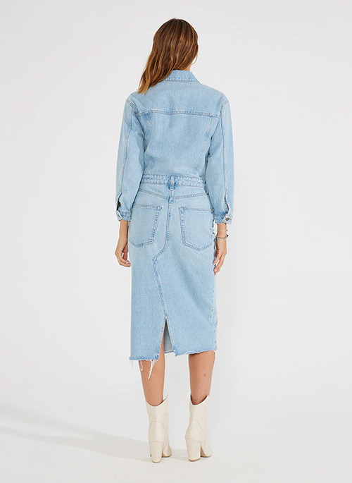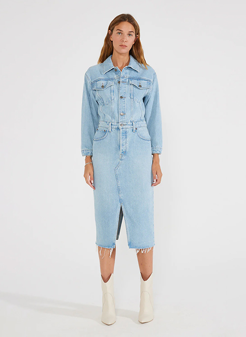 A feminine denim dress with authentic trucker styling provides the perfect casual look for any occasion, day or night.