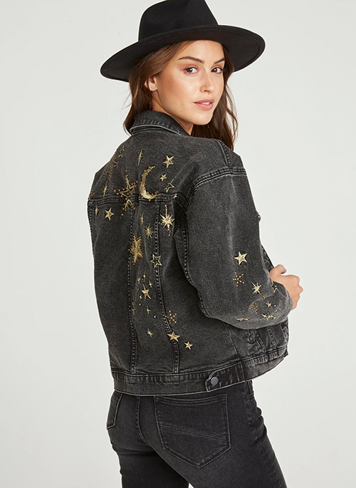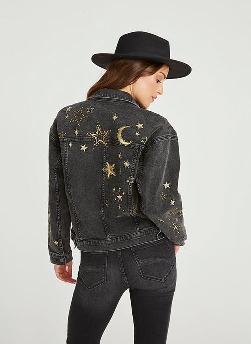 Denim Jacket with Gold Moon and Stars Studded Embroidery in Washed Black.Details: