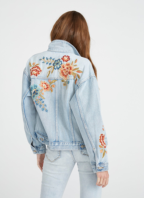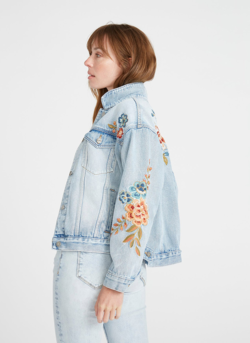 A classic-shaped light wash denim jacket with a hint of individuality with this Maui, orange, red and blue floral embroideryDetails: