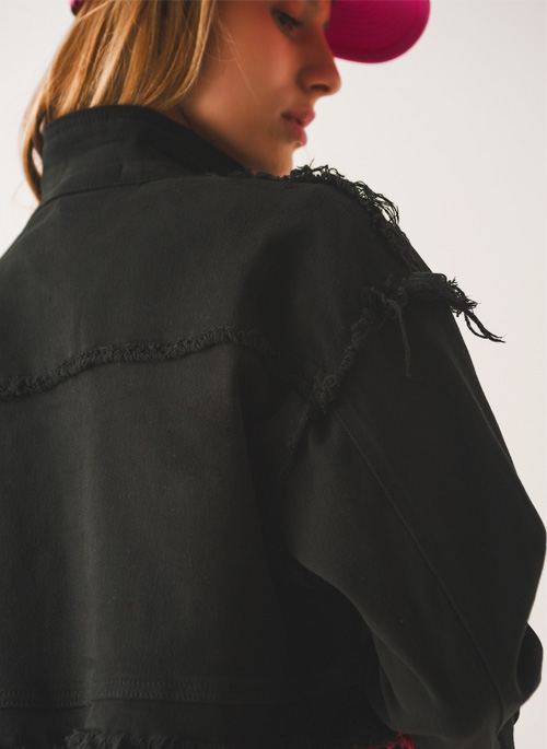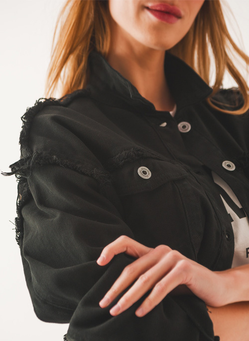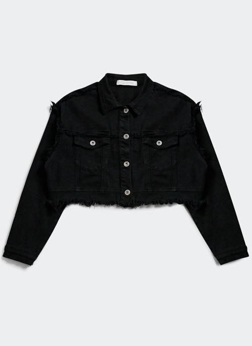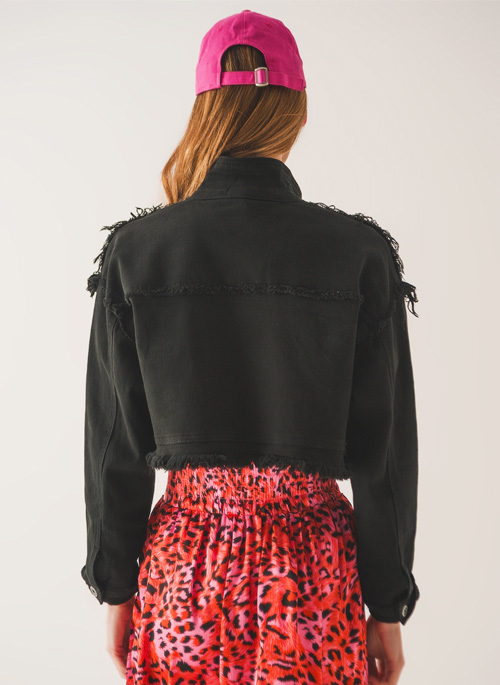 NEW CROPPED DENIM TRUCKER JACKET IN BLACK Details: 98% Cotton 2% Elastane. Model is wearing size S. Model is: 31-22-35 Height: 6". Runs true to size. Regular Fit. Style Nº: 1283001.