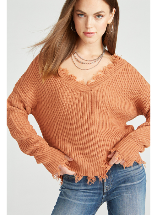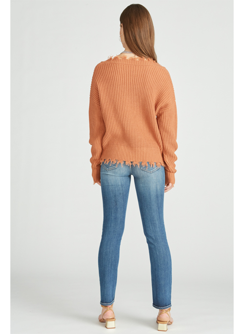 The destructed hem sweater is a trendy update to your sweater game with its oversized body and distressed detail.