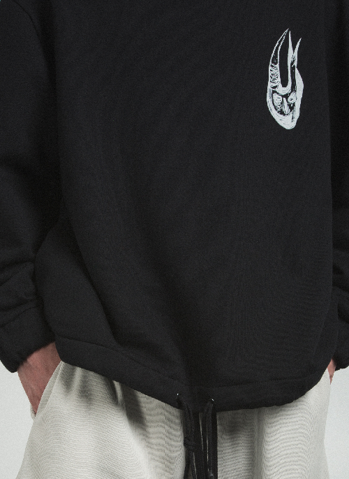 100% organic cotton printed jumper with soft lining and tapered fringe edge cords. The piece is finished with a black hem facing on the inside of the collar, which adds to the garment’s durability and longevity. The print design was created by tattooist and artist Aron Dimen. The design takes inspiration from the traditional rituals of Moha, a hundred-household village in Hungary, held on the last day of the carnival season. The design was first created as a lino print, then screen-printed onto each garment by hand in a small workshop in Budapest using a unique, eco-conscious dye. The fabric is sourced from qualified, European manufacturers and the garment is made ethically in Hungary.