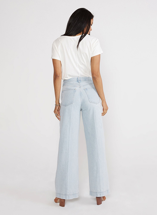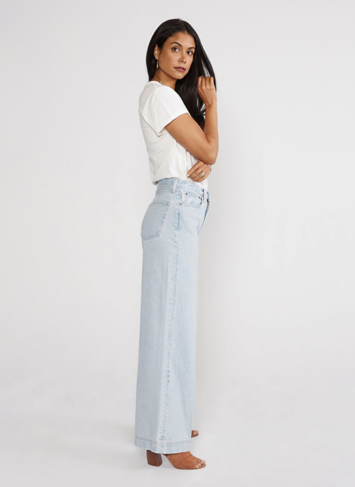 A high rise and a wide leg create a lean silhouette reminiscent of '70s denim. A bright light wash with careful fading finish the look.