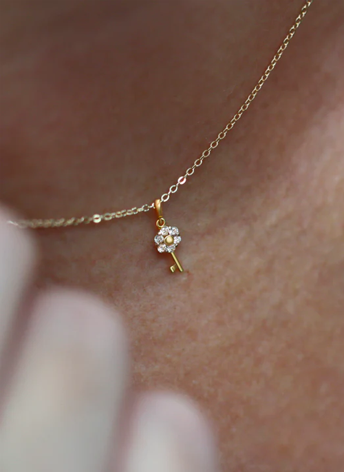 Our mini charm collection 14kt yellow gold and diamond key charm with 16 inch chain.