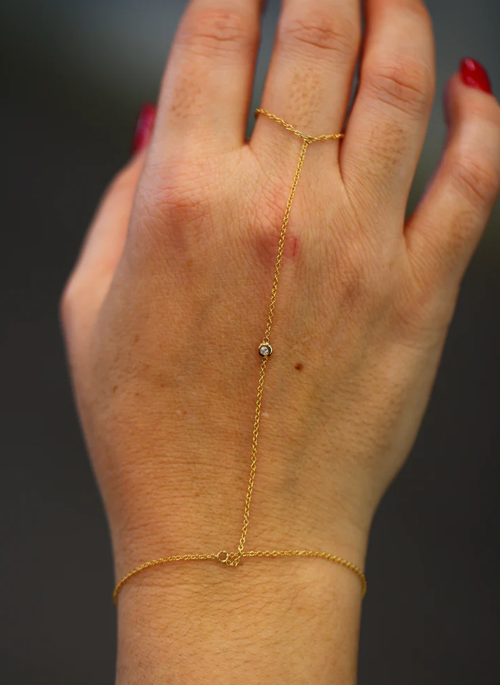 14kt gold bracelet and ring combo connected with a delicate chain adorned with a single diamond
