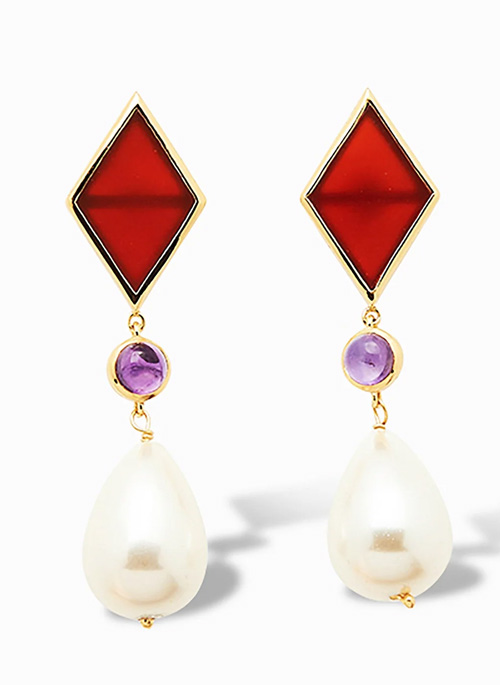 Our Diamonds Hot pearl drop earrings were designed with a diamond shaped red onyx stone to evoke vintage glamour and style. The diamond shaped post is linked to a teardrop pearl drop by a delicate amethyst stone juxtaposing modern style with a vintage look.