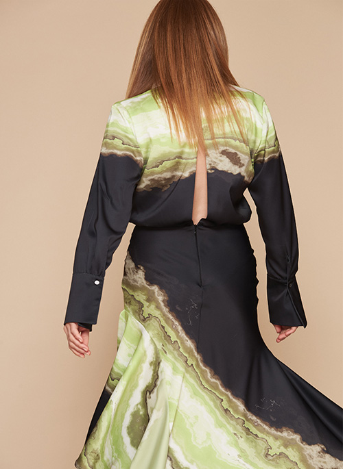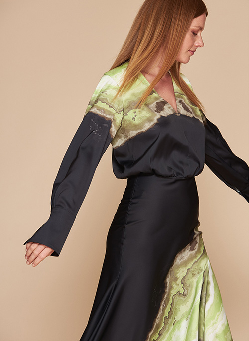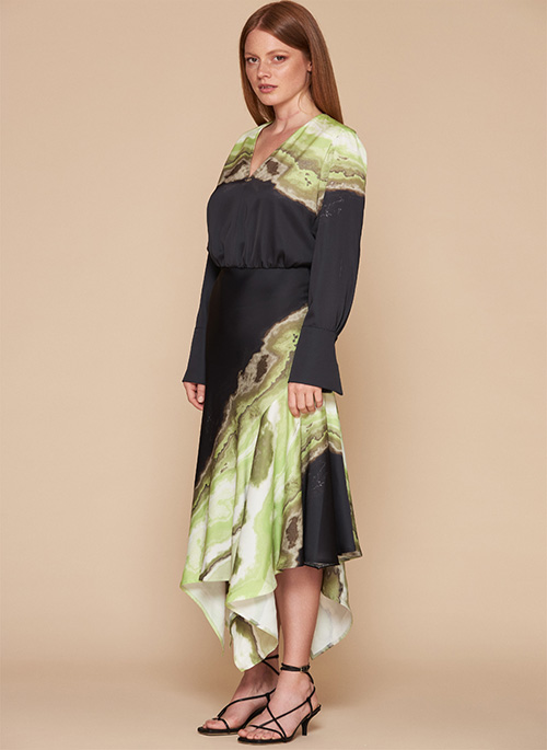This flirty dress is made entirely from recycled PET bottles and digitally printed with GOTS certified inks. Has long sleeves and asymmetrical hemline, perfect to wear it with boots and sandals.