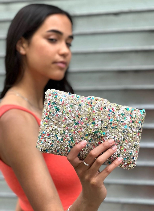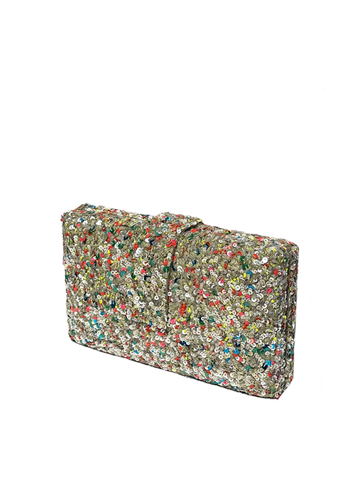 - Multi shaped sequins hand embroidered clutch with a magnetic belt flap as closure