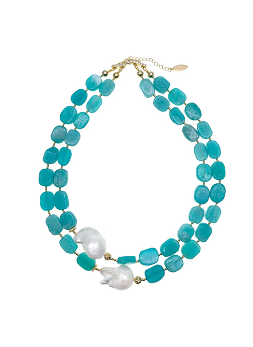 This handmade double strands necklace is made of amazonite with Baroque pearls and Japan golden plated brass findings. It's elegant and pretty which can be worn with dress, blouse or knitwear from day to night for any occasion. This necklace will make your whole wardrobe pop. Also, this is a very nice gift for birthday, anniversaries or festivals. It will be contained in a nice jewelry box with well packed.