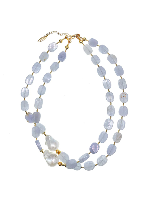 This handmade necklace features blue lace agate with Baroque pearls and Japan golden plated brass findings. It's beautiful and feminine which can be matching with dress, blouse or knitwear for any occasion. Pair with Farra earrings and bracelet to complete your look. Also, this is a very nice gift for birthday, anniversaries or festivals. It will be contained in a nice jewelry box with well packed.