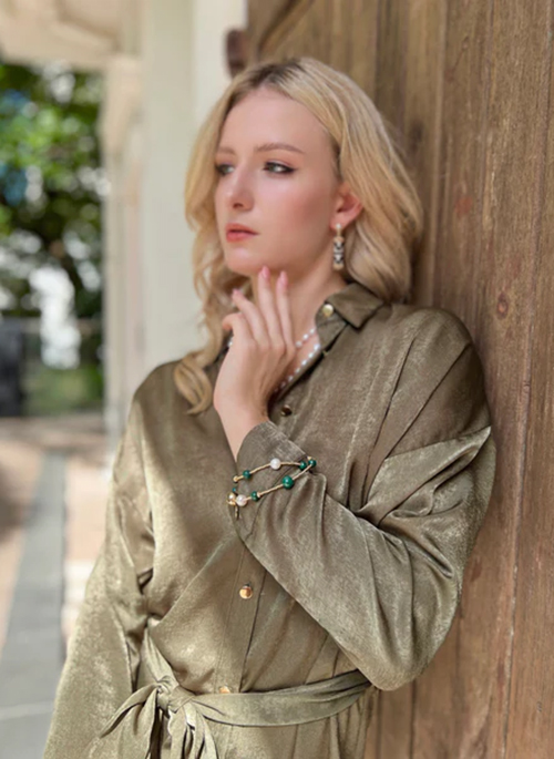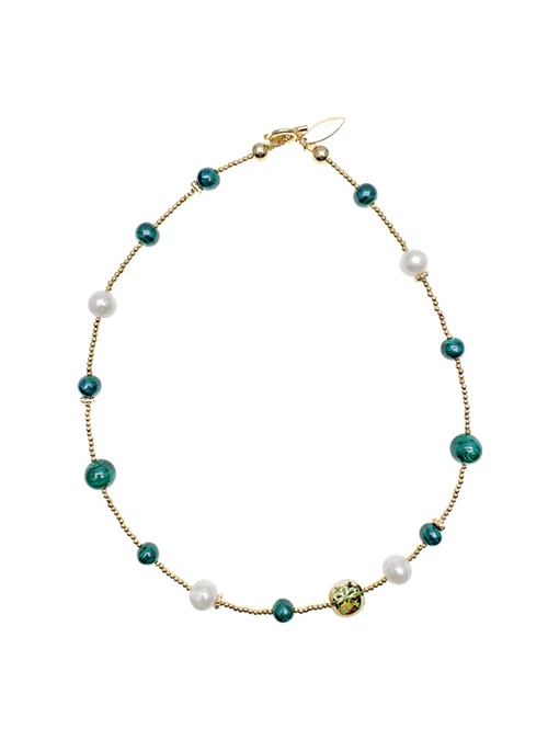 This handmade double wrapped bracelet features malachite, freshwater pearls with Japan golden plated brass findings. Wear it as bracelet or choker for special event or anniversaries. Matching with midi dress or blouse and pair with Farra freshwater pearls earrings to create your own style. Also, this is a very lovely gift for birthday or anniversaries.