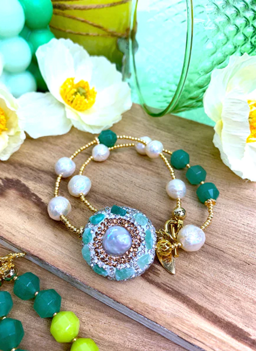 This handmade bracelet is made of freshwater pearls with aventunite and Japan golden plated brass findings. It's beautiful and feminine which can be worn as double wrapped bracelet or single choker from day to night for any occasion. Pair with Farra necklace and earrings to complete your look. Also, this is a very lovely gift for birthday, anniversaries or festivals.