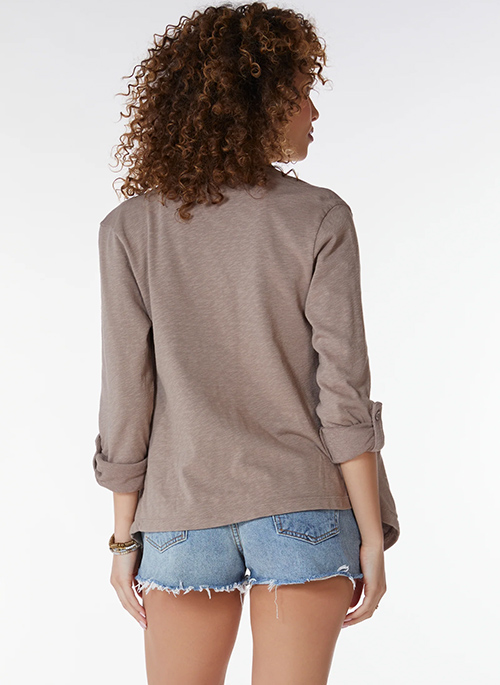 This versatile blazer has a flattering drape for easy layering. Featuring rolled sleeves, drape front, and front pockets. Throw over your favorite tee and pair with jeans.