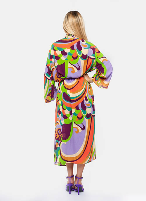 Spice up your summer with the 70s motifs of the Onda series in bright and brilliant colors. Perfect on the beach or in the city, the Miss Bikini dressing gown will give a touch of class to your summer looks. Wide and super cool, to be worn also as a kimono on jeans, this dressing gown is made in a lively and chic printed version. Essential in the wardrobe of those who follow trends, it will complete the outfit in an original way. Equipped with a comfortable belt and strategic loops, it will accompany you from morning to evening.