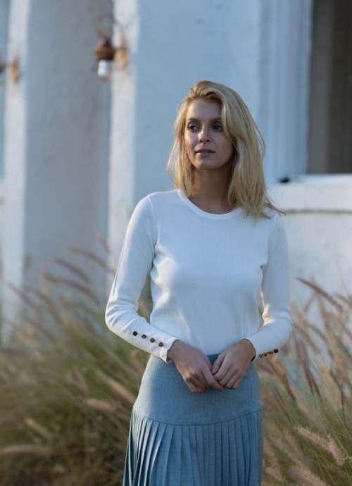 A dressy sweater featuring a long buttoned-sleeve, that turns heads every time!