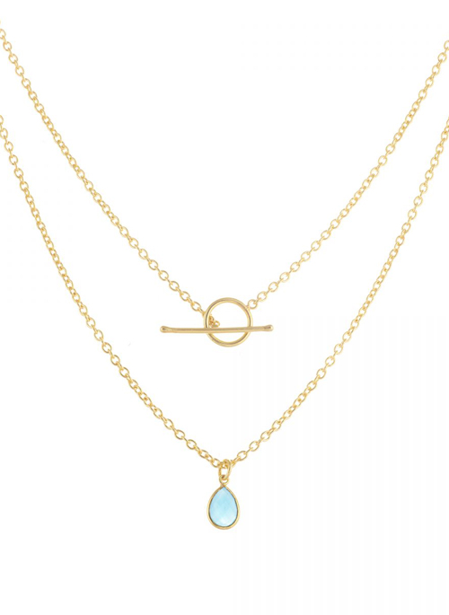 A delightfully feminine, tear-shaped gemstone pendant simply encased in gold-plate and hung on a matching gold-plate cable chain. The clasp is simplicity itself – a round hoop, slotted with a tie-pin like bar. As timeless as the Little Black Dress, it comes in sky-blue chalcedony, labradorite or black onyx.