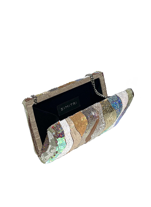 Are you tired of looking for the perfect arm candy? Our Dune clutch handcrafted with mixed metallic sequins is a sight for sore eyes and will be your own little oasis in the desert of boring clutches. True to Simitri’s ethos of making unboring and uninhibited bags, your new clutch will keep you on your toes with her shimmering sight and you’ll never feel like this new accessory has been there, dune that.