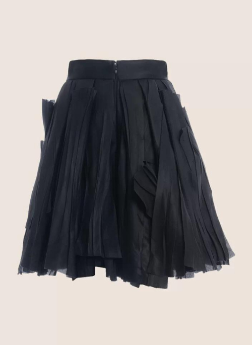 Black flared skirt in silk organza handmade to create the pleated effect. The waist belt is in tone-on-tone duchesse with invisible zip closure and central rear hook. Head designed and made entirely in Italy.