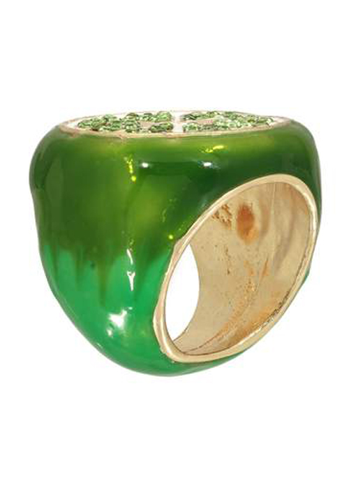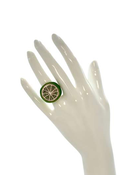 This fun, everyday statement ring is perfect for Happy Hour Margaritas on Taco Tuesday! Such a playful fun add-on to any outfit, the green, citrus-inspired ring has an engraved lime face front with all over enamel finish. The lime center is complete with crystal rhinestone embellishments. The wide band graduates from the front to the back for easy wearability. Handcrafted from gold-plated rhodium and cut in a round shape, this ring is perfect for layering.