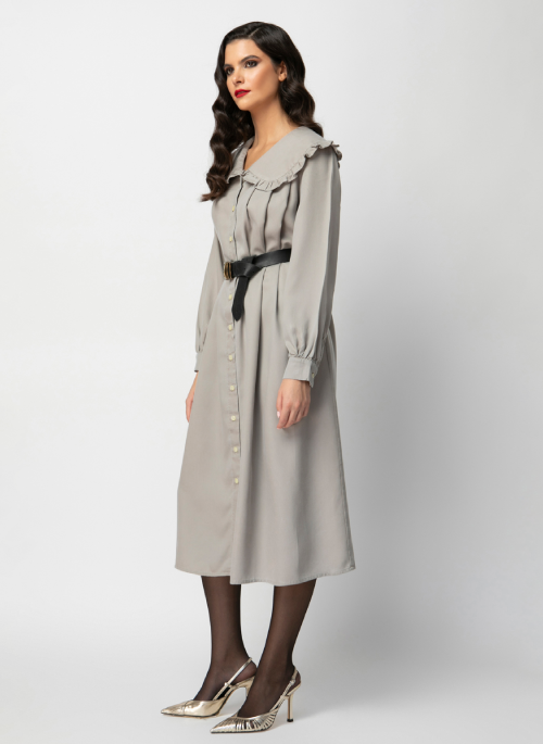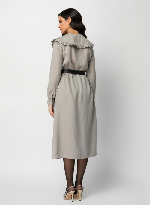 A cross between a shirt and a dress, the neutral "Elaine" dress is made to wear everywhere, from day tonight. With its ruffled trimmed collar and balloon sleeves, it's so easy to wear and style. Cut from a premium twill, made of certified Lenzing Tencel yarn, it features a really flattering loose fit. It features buttons down the front and in the cuffs. Use one of our fav silk scarfs as a self-tie sash to define your waist and style it with knee boots.