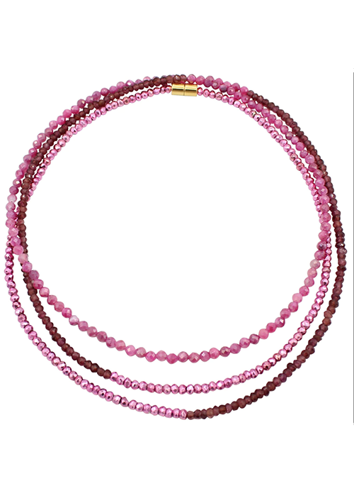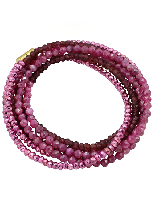 - Hand beaded gemstone strand necklace with semi-precious stone and magnetic closure. Can also be worn doubled or tripled as a choker or 6x around as a bracelet. Measures 43".