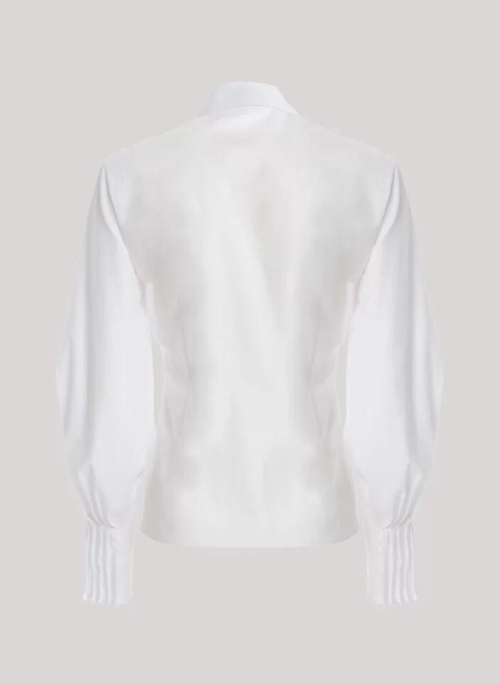 White fine cotton shirt with puff sleeves, high pleated cuffs and gathered tone-on-tone silk taffeta flounce in the center on the front. The buttoning is central and hidden, enriched by the single visible button on the neck, covered in copper-colored fabric. Head designed and made entirely in Italy.