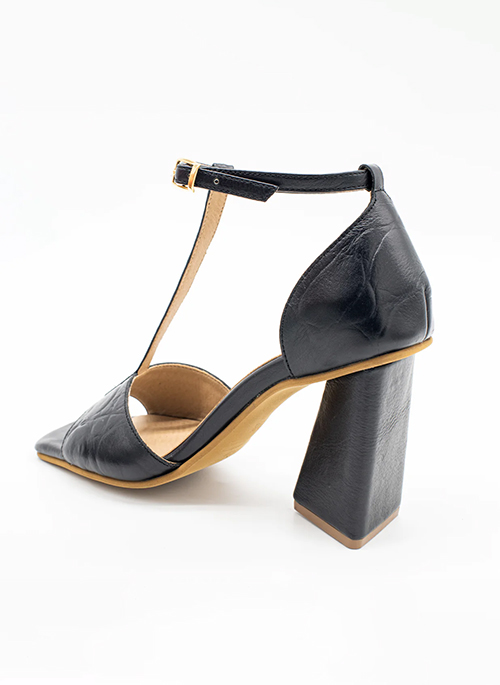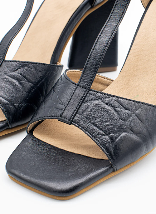 From day to night the compliments will be endless in our Elixir sandal heel. Featuring our unique leather wrapped triangle heel and embossed leather creates a classy monochrome shoe. Each pair is truly unique through our artisans embossing process, patterns on the leather will naturally vary.