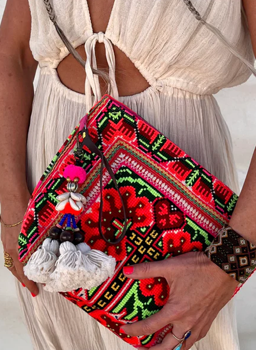Traditional hand embroidered tribal textile is used to create this zip clutch with ultra suede lining and interior side zip pocket. Leather handle and hand made pom pom tassel.