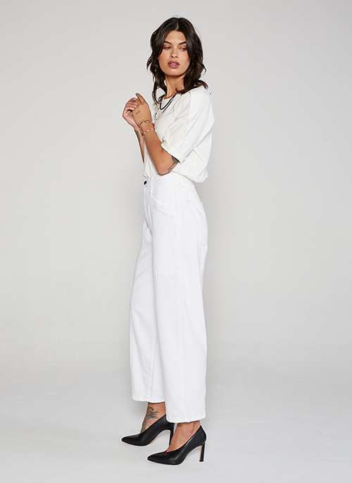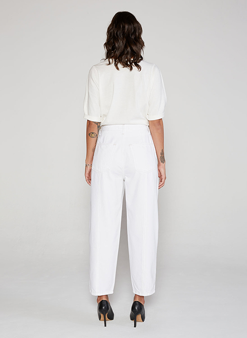 A clean, relaxed fit pant with a high rise and a subtle taper to the leg. Utility pockets and seaming details finish the look.