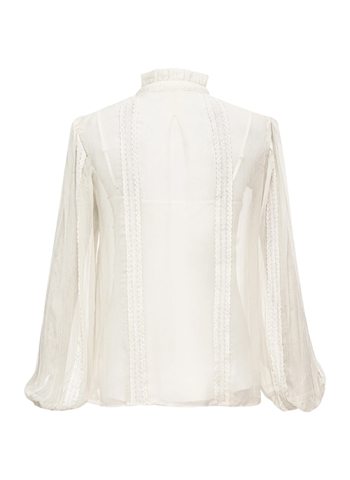 A long sleeved blouse with Henley style buttons that is simply full of details. The semi-sheer chiffon fabric lends itself to careful pleating and shirring around the neck, shoulders, cuffs, and front bodice. The top has a flowy look and fits due to its back pleat. This shirt is finished with lace detailing throughout, elastic cuffs, and a removable lining.