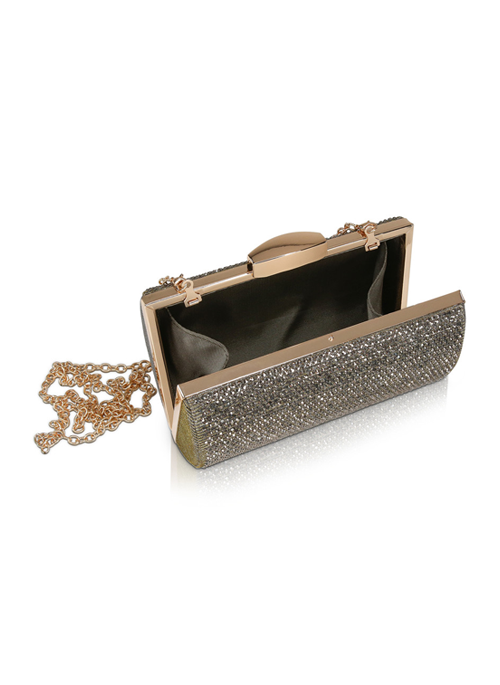 - Not only does this minaudière exude a sense of timeless elegance, it also boasts functionality. Featuring a removable 22" drop chain, this stunning piece provides versatile styling options, allowing you to wear it as a clutch or a shoulder bag, while the lift clasp closure ensures that your essentials are secured in style.