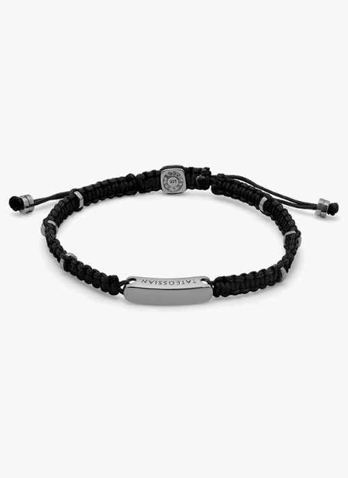 The engravable sterling silver bar is set in black rhodium with black sterling silver disc elements added around the bracelet to give little flashes of light throughout the design. Our intricately hand-wrapped, black macramé takes up to two hours to complete and is made to adjust in size. To open, simple pull the two ends of the bracelet away from one another. Add your personal messages with our engraving service.