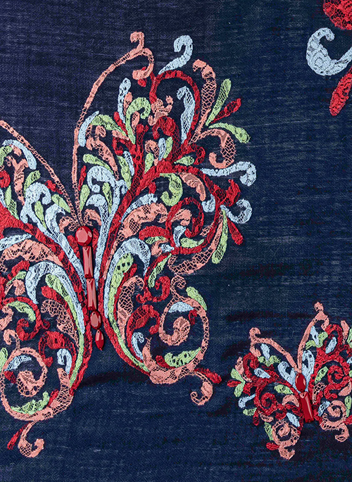 This navy blue scarf is woven from an incredibly soft cashmere wool and is handcrafted with elaborate oversized butterfly appliques made from contrasting bold multi colored laces. This is an absolute 'must have' signature Maneesha Ruia scarf for any discerning woman.