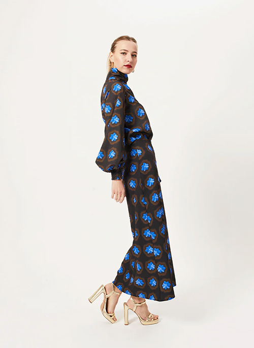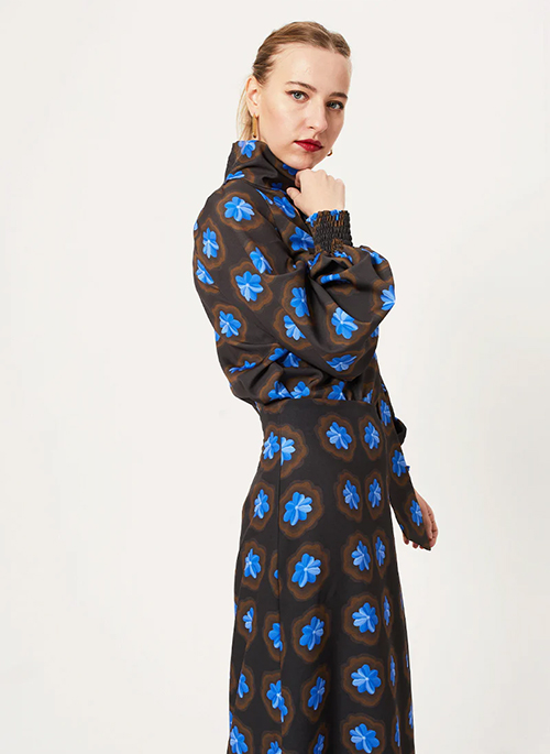 Our best selling shape to date - The Esme but with a more retiring sleeve. Still with a tie scarf neck and in our brand new print Brown and Blue Flower. Get ready to stand out!