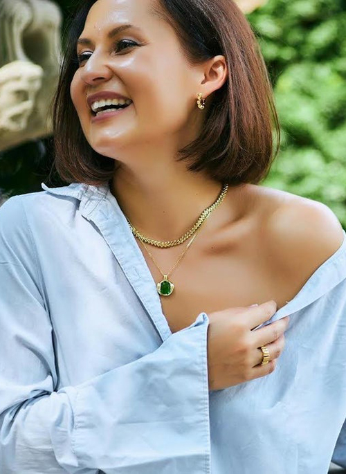 Esmeralda is inspired by the green spaces in New York City, a dream of ordered nature - just a little wild - within reach of urban life. The green glass pendant creates a distinctive focal point. Paired with a delicate chain for a perfect duo you'll never take off.