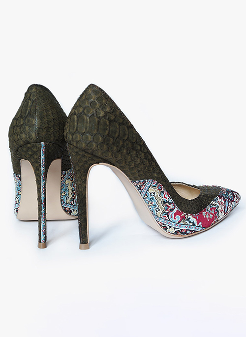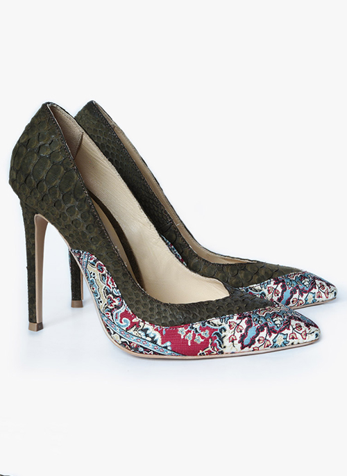 Persian inspiration stiletto heels made from natural leather and decorated with embroidered oriental textiles.