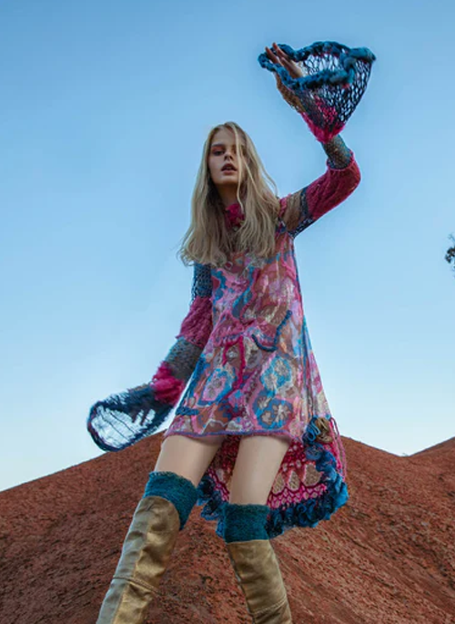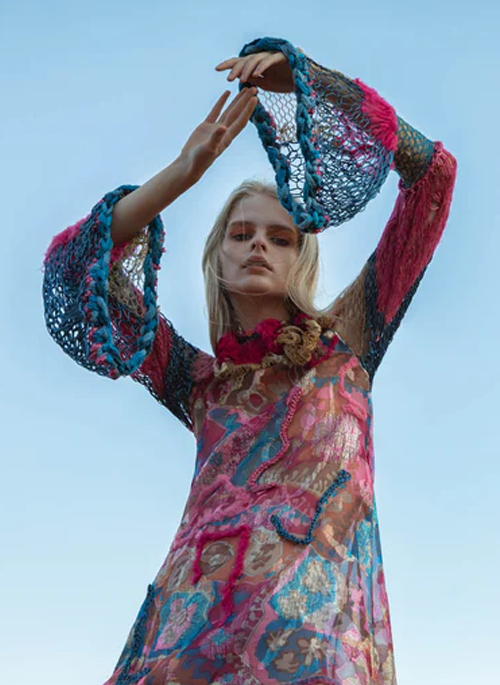 - Transformed by adding flared mixed yarn loose knit butterfly sleeves with matching ruffle train and flower collar