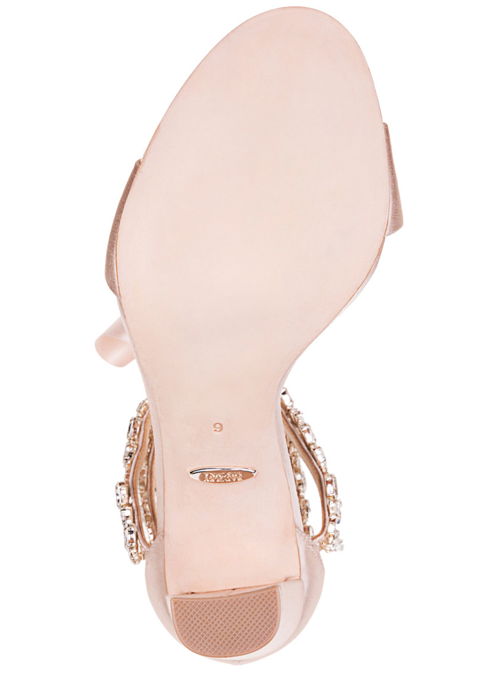 This stacked heel features a simple, open-toe, satin strap in the front, while the high-back ankle is adorned with three ornate, floral-inspired, crystal embellishments on each side. The straps come together to meet at a tie-front ribbon which gives this shoe a beautiful and dramatic uplift. The extra sparkle and beautiful bow make the Everafter look like it was designed in a modern day fairytale.