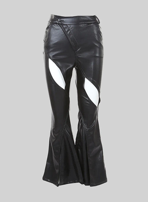 Details: Faux leather cutout pants Crop length Asymmetrical zipper Boots cut design Imported