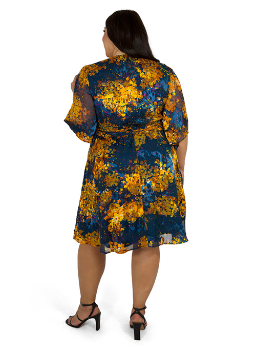 Fun and flirty! This feminine gold and blue printed flutter sleeve wrap dress will be your go to dress. It's guaranteed to make you radiate positivity.