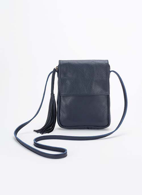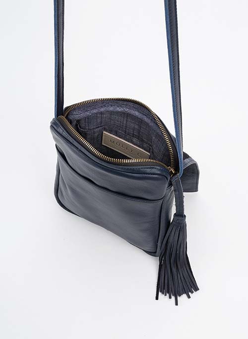 Featuring Molly G's signature buttery leather and a long, slender delicate strap, Fay's our super feminine crossbody/shoulder bag, now with vintage indigo mud cloth. Organized, but playful. Gotta love that fun tassel! Definitely the ideal everyday handbag for your essentials.